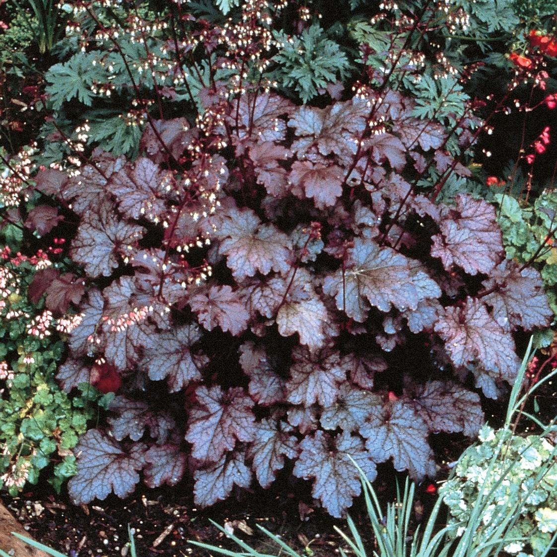 Гейхера аmеthуst Mуst – это гибридное, невысокое почвопокровное растение, притягивающее внимание своей необычайной окраской. Высота взрослого растения достигает 20–30 см. Листовые пластины кожистые, темно-аметистового цвета оживляются серебристыми пятнами. К осени пятна светлеют, а цвет приобретает бордово-зеленые оттенки, что еще больше подчеркивает контрастность сочетаний. В июле гейхера зацветает, выбрасывая длинные, возвышающиеся над основным кустом цветоносы с мелкими, собранными в рыхлые метелки цветками. Сорт довольно неприхотливый, но боится вымокания, поэтому при посадке необходим дренаж почвы. В бесснежные зимы лучше укрыть
