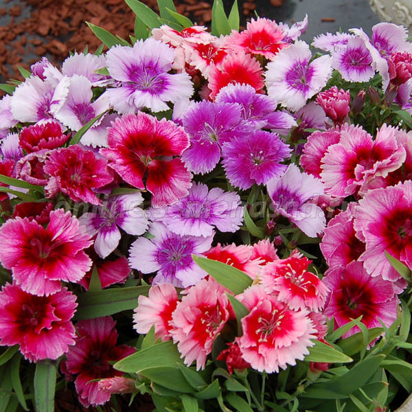Нарядные махровые многолетние гвоздики с большой палитрой окрасок! Растение образует плотные подушки высотой 30-40 см. Цветки махровые, с бахромчатыми, разрезанными по краю лепестками, самых разнообразных окрасок. Цветет обильно все лето, отличается приятным ароматом. Используют для срезки, бордюров, клумб, на каменистых горках, для озеленения балконов.