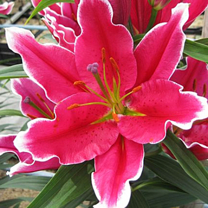 Лилия восточная Фурио (Lilium Oriental Hybrid Furio) станет настоящими жемчужинами вашего сада. На стеблях высотой 110 см распускаются крупные, диаметром до 20 см, малиново-красные цветки с приятным ароматом. По центру волнистых лепестков расположены темно-малиновые полосы и редкий крап, а их края эффектно очерчены белой контрастной каймой.